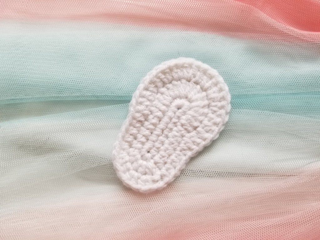 Row 2: ch 2 / 12 HDC / 1 DC / 6 inc DC / 1 DC / 13 HDC / 2 inc HDC / slp st.